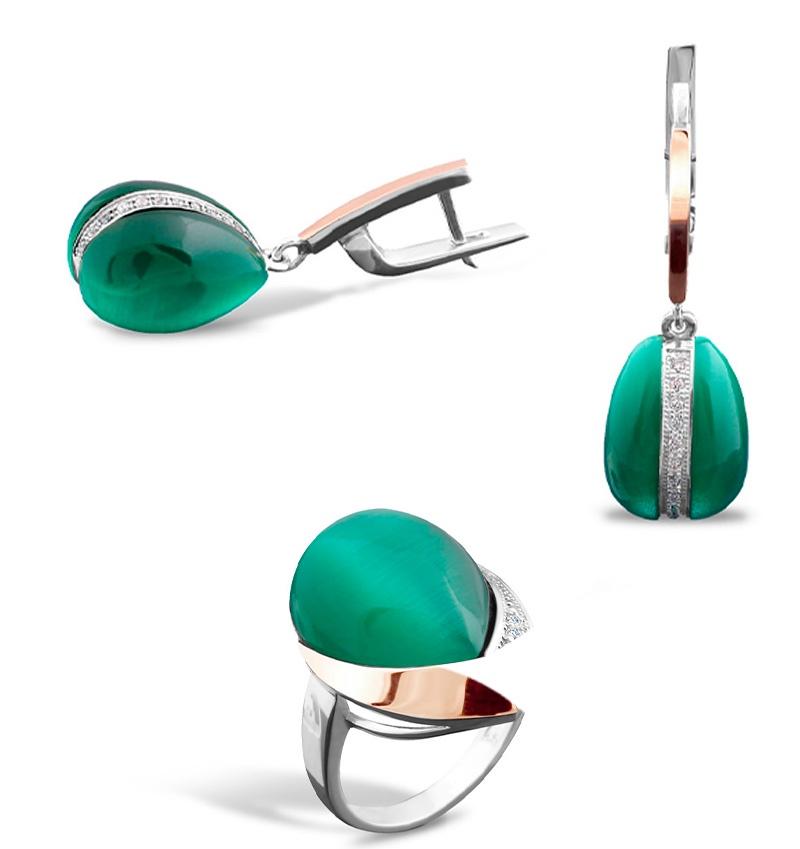 Un set de argint cu inserții de aur cu ulexit și zirconiu